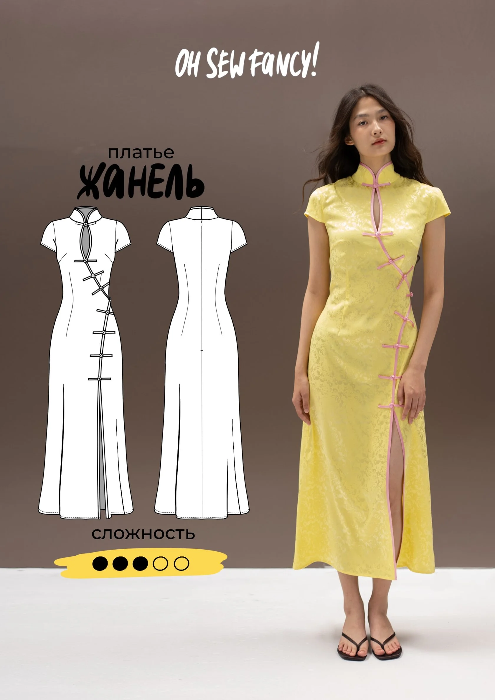 Выкройка платья – приталенного силуэта, расклешённого к низу. Прилегание к фигуре достигается за счёт выточек на полочке и спинке. Полочка асимметричная, с вырезом-каплей до линии груди. Слева расположен разрез. Фигурные линии полочки обработаны контрастной косой бейкой. В качестве декоративного элемента предусмотрены застёжки-узелки на полочке.
