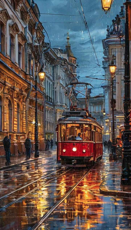 Дождливый пейзаж городской улицы. На дороге отражаются огни фонарей, старинные дома окутаны мягким сиянием, а по рельсам неспешно движется красный трамвай